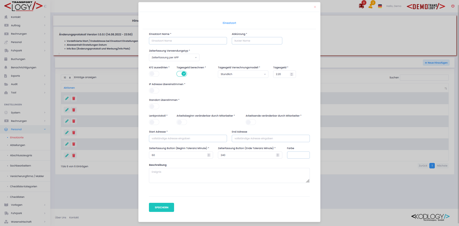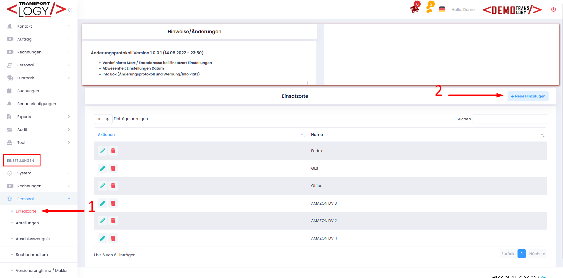 1: Klicken Sie im Seitenmenü unter den Einstellungen auf Personal/Einsatzorte, um einen neuen Einsatzort zu definieren oder vorhandene zu bearbeiten.